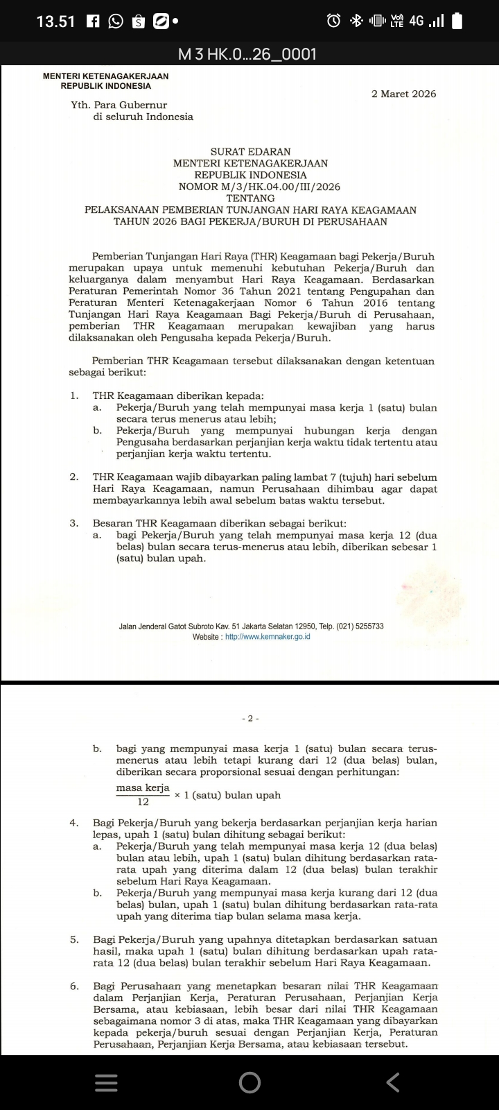 Aturan tersebut tertuang dalam Surat Edaran Menteri Ketenagakerjaan Nomor M/3/HK.04.00/III/2026 tentang Pelaksanaan Pemberian Tunjangan Hari Raya Keagamaan Tahun 2026 bagi Pekerja/Buruh di Perusahaan yang ditandatangani pada 2 Maret 2026.